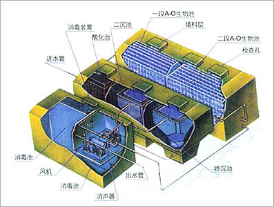 污水由各產生點匯集到集水池(化糞池),由污水泵經細格柵進入曝氣調節池,經曝氣充氧后,再由提升泵送入接觸氧化池,接觸氧化池為本裝置的主體設備,是利用好氧菌在曝氣充氧、攪拌的條件下,以填料作為生物載體,污水中有機物作為營養源,通過微生物的生長過程,將污水中有機物分解、消化,起到脫氧、除磷、降低BOD值的作用。經數級接觸氧化后,進入沉淀池,上清液溢流至終端水室(消毒室)后排入,下部污泥由污泥泵泵入污泥濃縮池,污泥經好氧消化后,上清液排入集水池,下部少量污泥用糞車抽出外運,也可將污泥干化處理。
